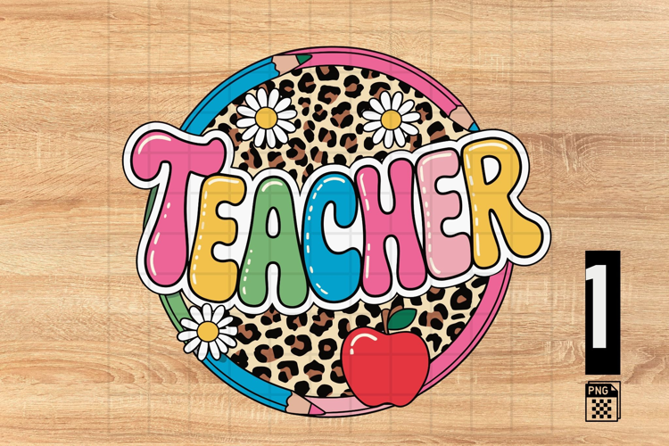 This high-quality graphic features a fun retro bubble-letter “TEACHER”, cute daisies, pencils, an apple, and a trendy leopard print background — all inside a vibrant circular badge. Perfect for teacher shirts, tote bags, mugs, classroom decor, and print-on-demand products.