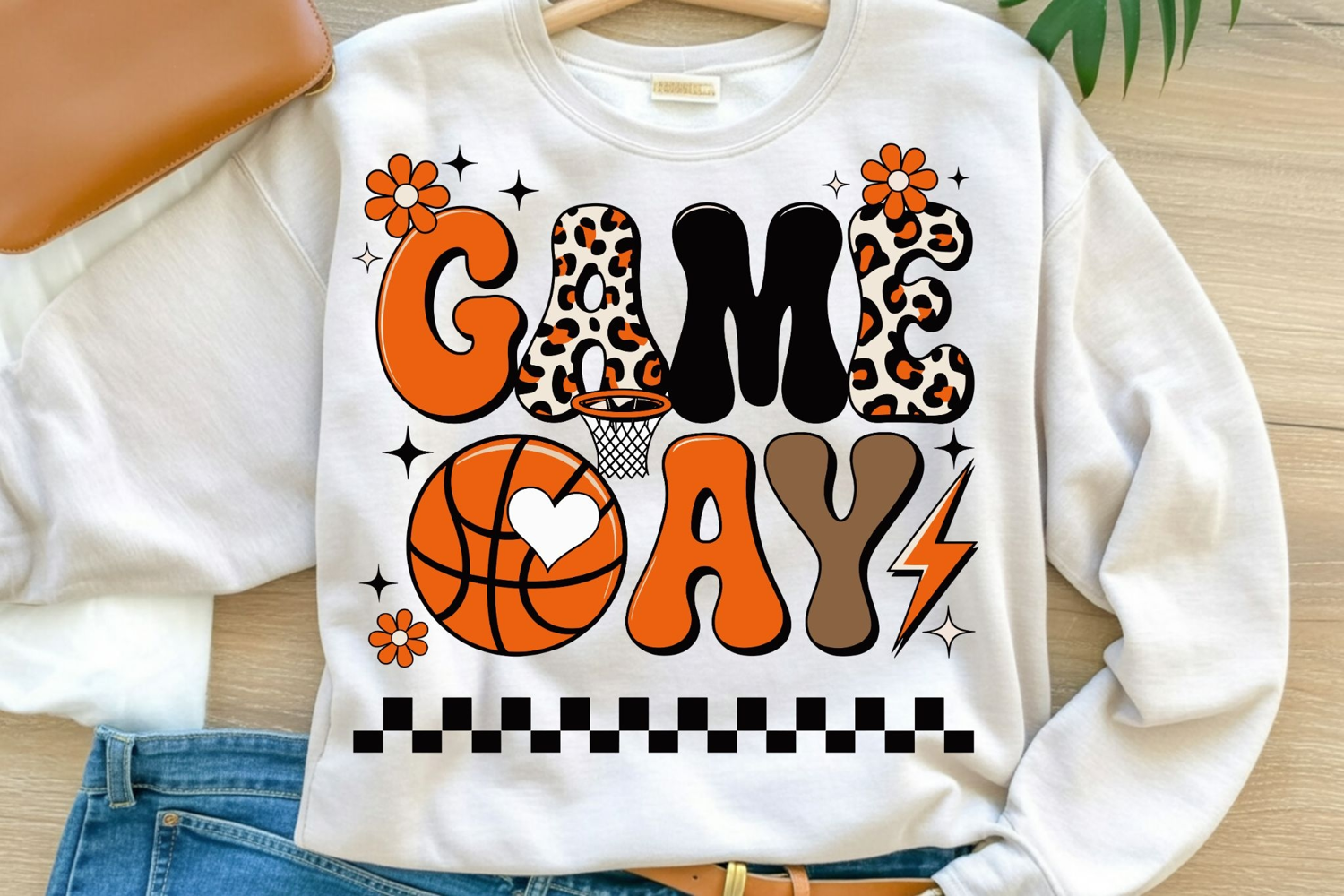 Game Day Basketball Sublimation Design | Leopard Print Game Day PNG with Retro Letters & Checkered Border | Sports Mom Shirt Graphic