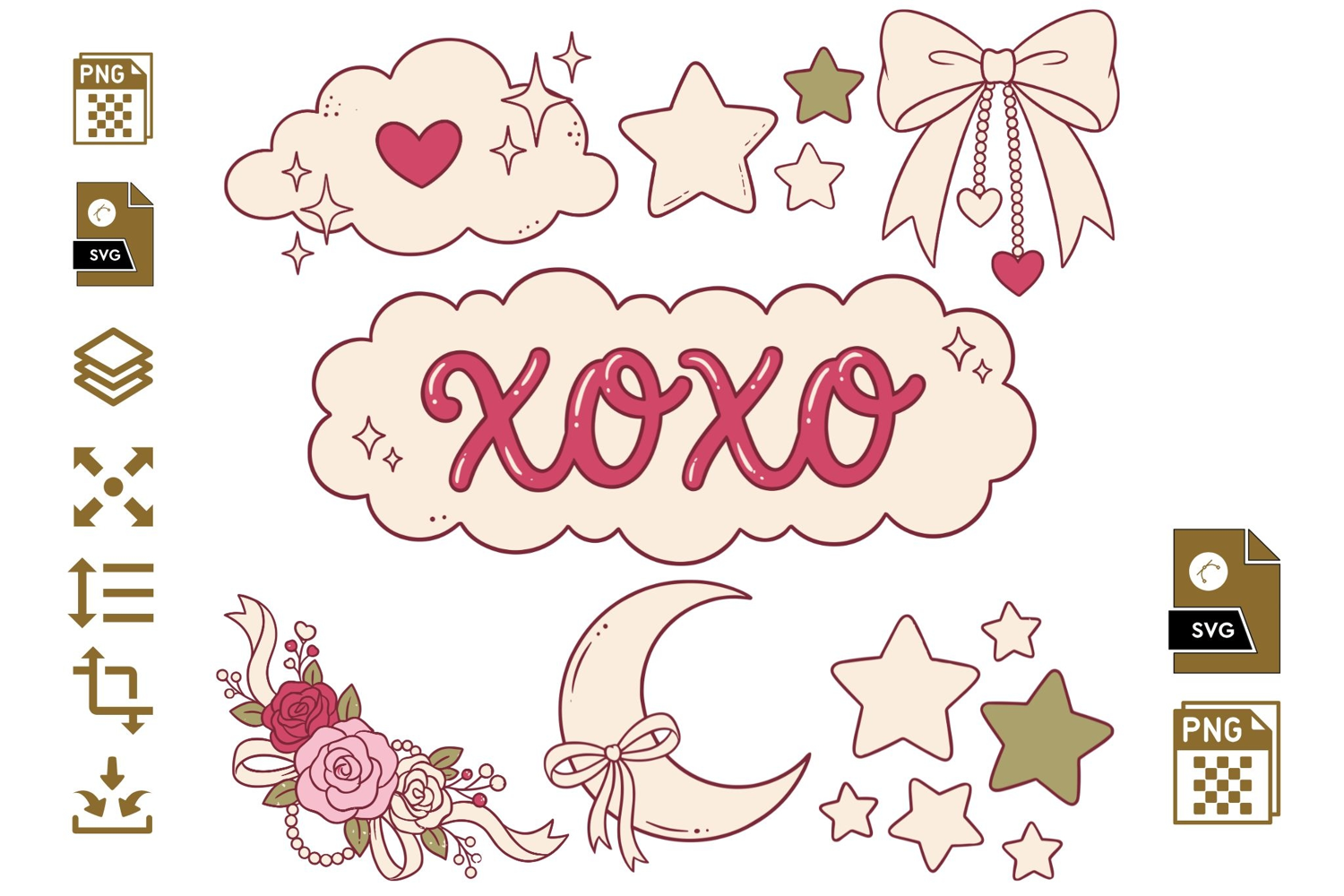 XOXO Coquette Valentine Clipart PNG SVG, Pink Bow Moon Stars example image 1