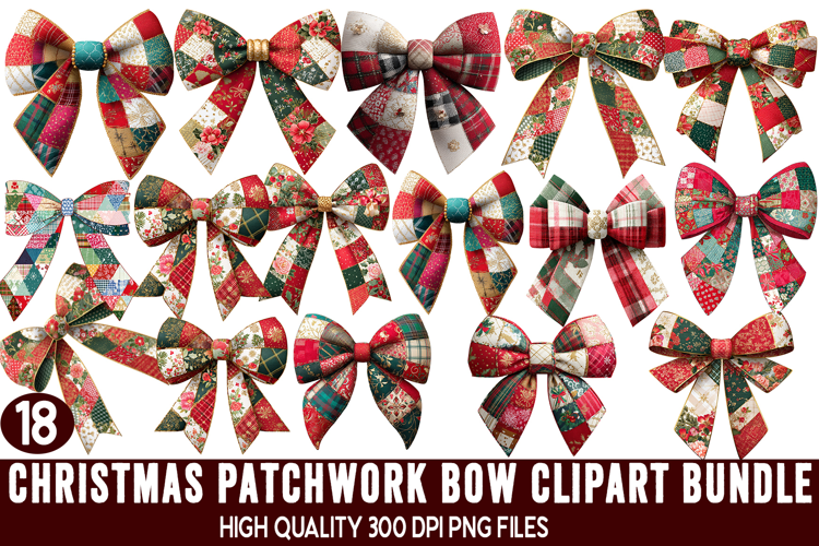 ✔ Christmas Patchwork Bow Clipart PNG Bundle: 18 PNG