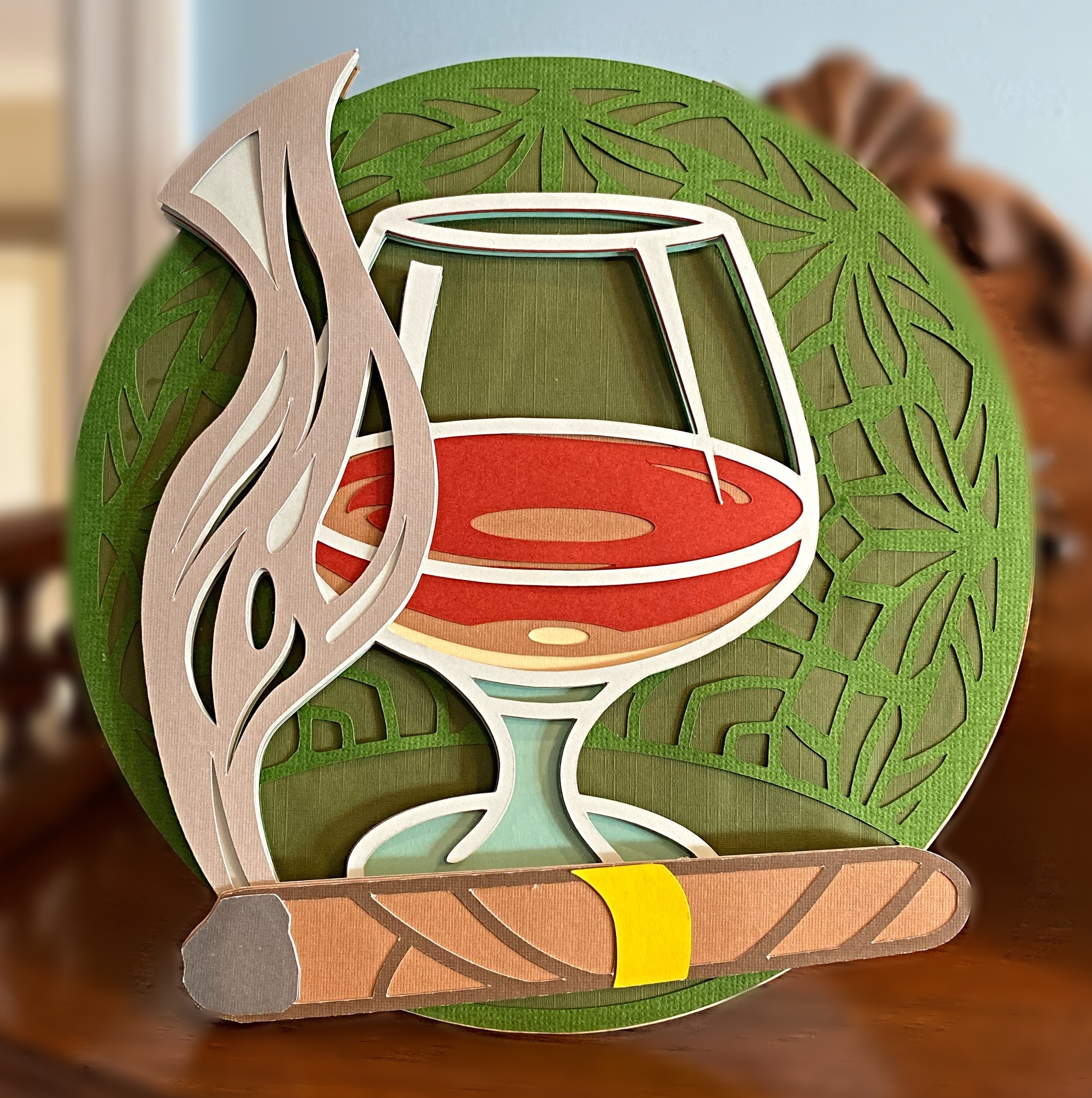 A layered cutting file of a glass of brandy and a smoking cigar SVG. A sophisticated design for the distinguished brandy connoisseur!