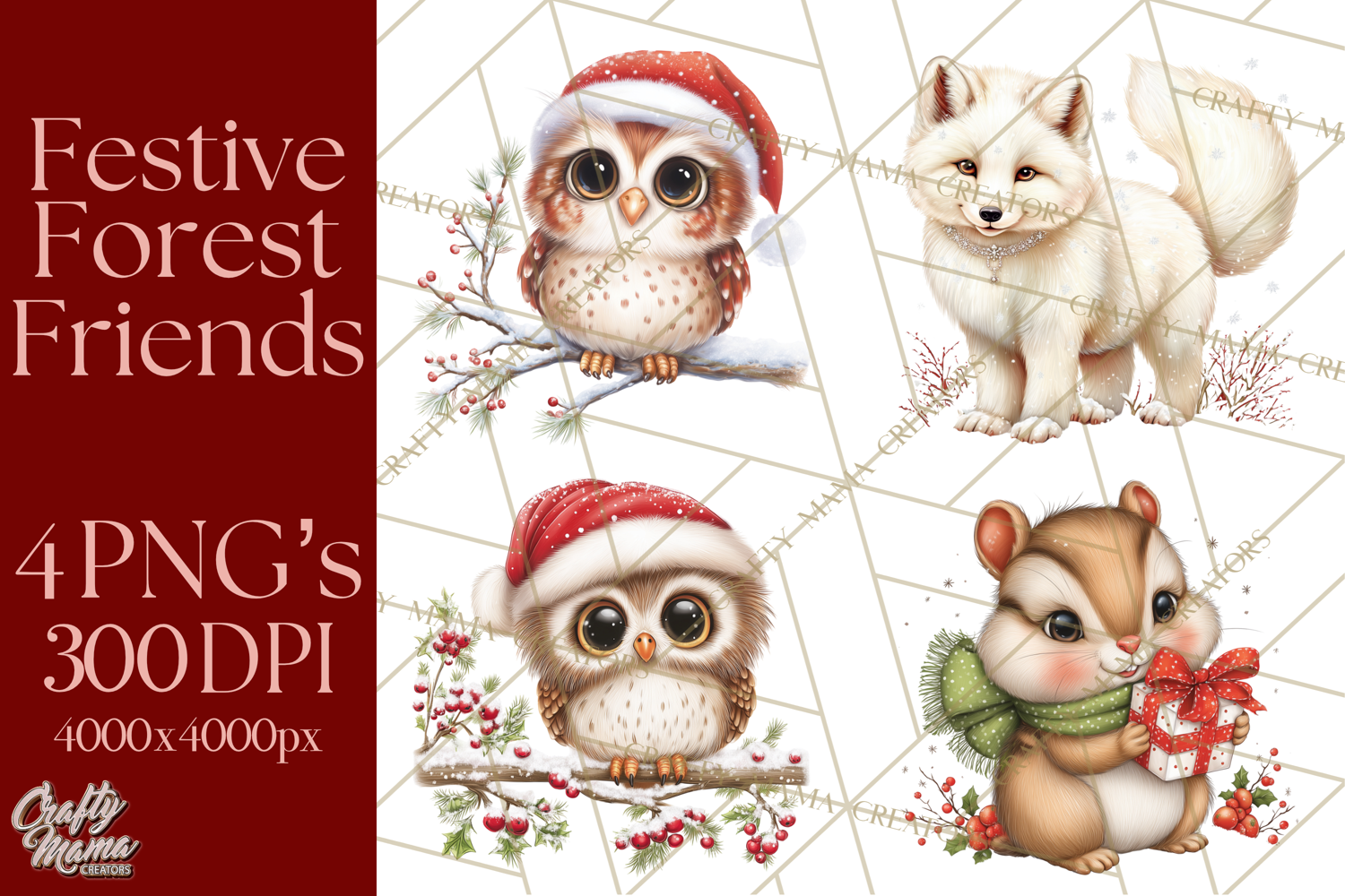 Celebrate the season with this cozy set of festive woodland animal clipart! This bundle includes 4 high-quality PNG illustrations of charming forest creatures—like foxes, deer, rabbits, owls, and more—wearing scarves, Santa hats, and holding candy canes, gifts, or ornaments. Rendered in a soft, realistic art style, these animals add a heartwarming touch to your holiday designs.