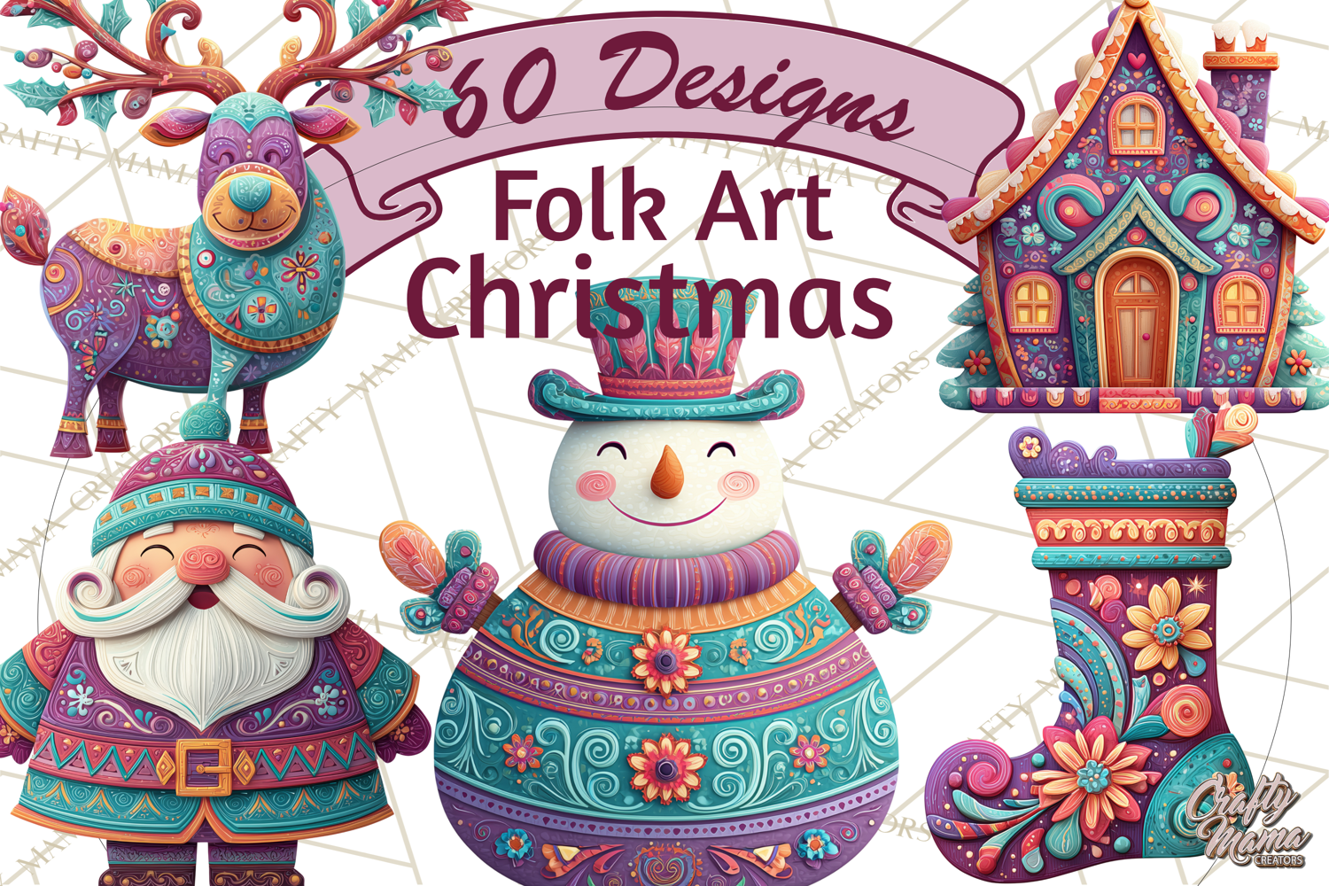 Brighten your holiday projects with this enchanting collection of 60 unique Vibrant Yuletide Friends clipart images! Each classic Christmas character is reimagined with a cheerful, stylized folk-art approach, adorned with incredibly bright, saturated colors and intricate, festive patterns.