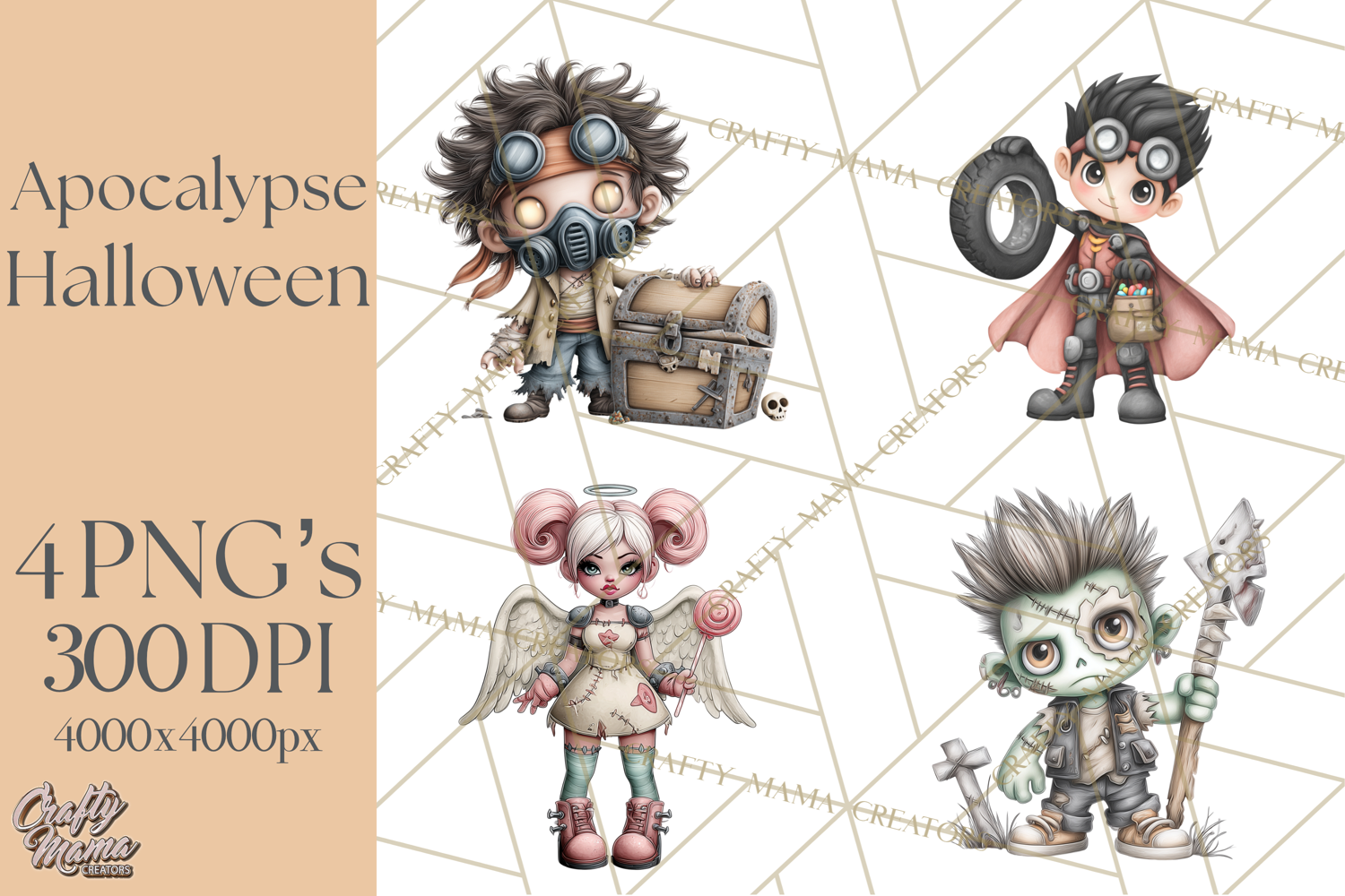 Survive Halloween in style with this gritty, imaginative clipart bundle! These 4 PNG files feature rugged, post-apocalyptic characters—including trick-or-treaters in patched-up costumes and mutated animals—scavenging candy in a desolate, overgrown world. From rusted wagons to glowing irradiated pumpkins, each design is packed with eerie detail and grungy charm.