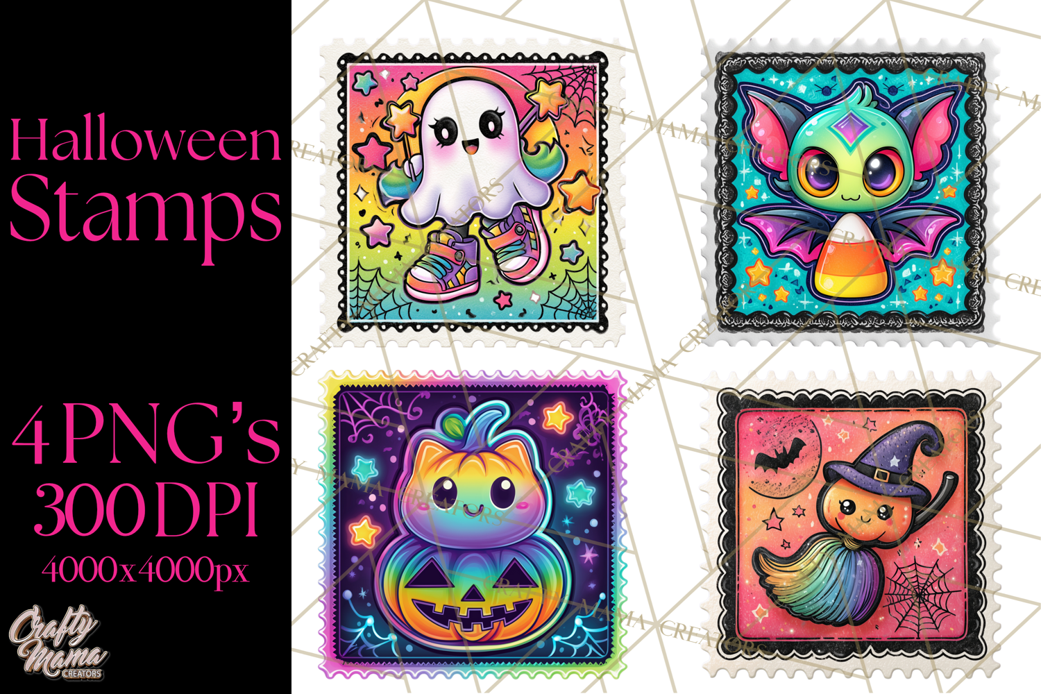 Get ready to glow with this 4-piece clipart bundle featuring super cute, vibrant neon Halloween postage stamps! Perfect for your spooky projects, invitations, party decor, stickers, scrapbooking, and more. Each stamp takes on a neon, almost glittery look to bring lots of excitement to the holiday!