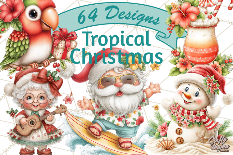 Escape to a tropical paradise this holiday season with our warm-weather Christmas clipart! This unique collection features a surfing Santa, festive flamingos, and sand snowmen, perfect for adding a sunny twist to your seasonal projects. Use these charming designs to create greeting cards, invitations, scrapbooking pages, and more.