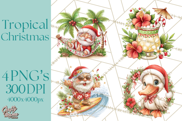 Escape to a tropical paradise this holiday season with our warm-weather Christmas clipart! This unique collection features a surfing Santa, festive flamingos, and sand snowmen, perfect for adding a sunny twist to your seasonal projects. Use these charming designs to create greeting cards, invitations, scrapbooking pages, and more.