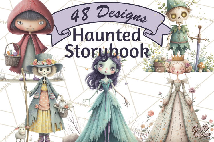 Step into a darker fairytale with this Haunted Storybook Clipart! This set includes 48 high-quality PNG images of classic storybook characters reimagined with a spooky, haunted twist. Perfect for creating unique invitations, gothic decorations, t-shirt designs, or digital scrapbooking. All files are in PNG format with a transparent background.