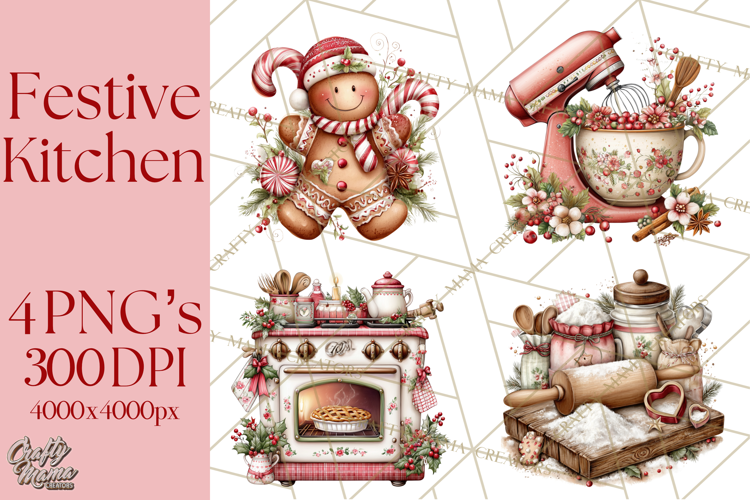 Get your digital mixers and spatulas ready! This festive collection features adorable illustrations of Santa, elves, and Mrs. Claus in their kitchen, along with charming gingerbread men, decorated cookies, and all the sweet accessories you'll need. These high-quality files are perfect for creating holiday invitations, recipe cards, craft projects, and more.