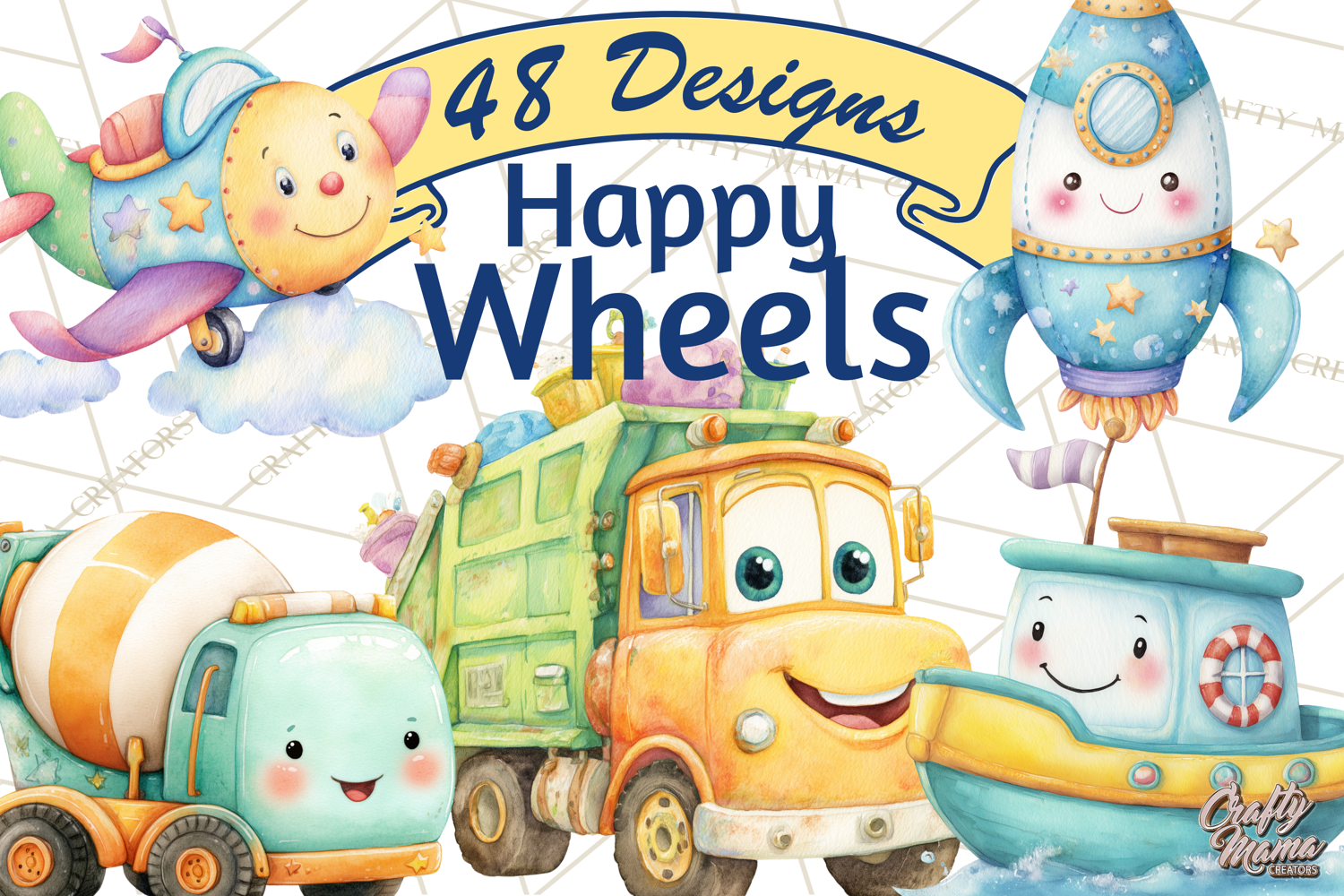 Bring your designs to life with this Whimsical Transportation & Vehicles PNG Clipart collection! Each illustration features a smiling face and watercolor children’s style, perfect for printable and digital designs.