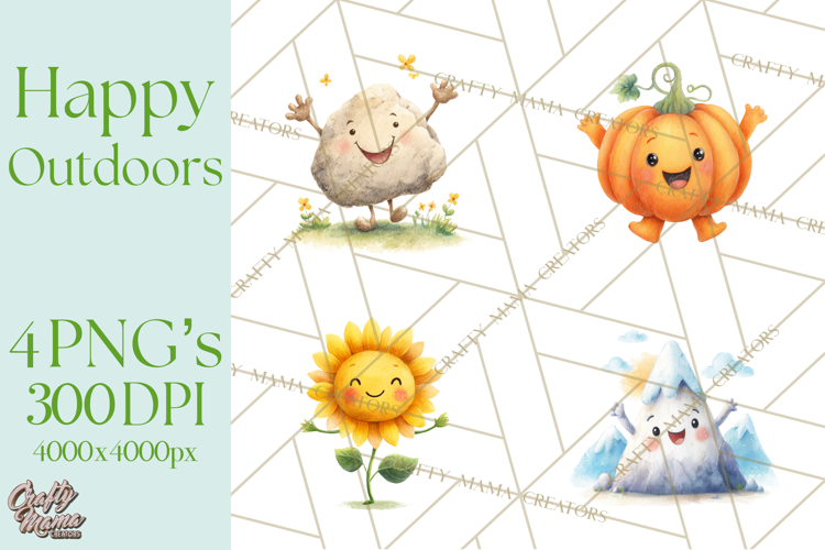 Bring the beauty and charm of the outdoors to your creative projects with this Nature & Outdoors Clipart collection! Each illustration has a cheerful face and whimsical watercolor style, perfect for printable and digital designs.