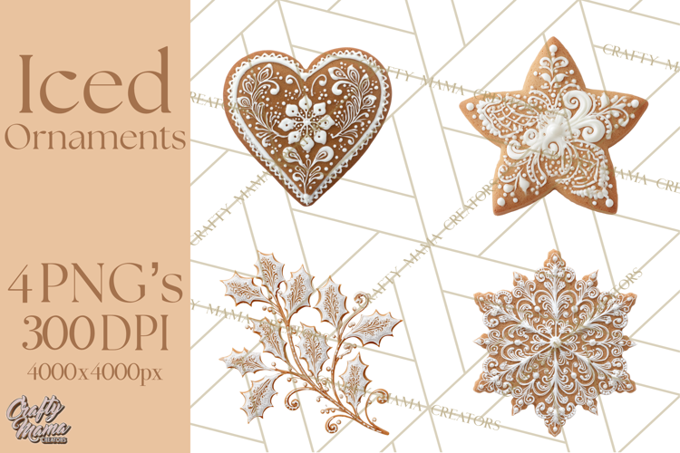 This delightful digital clipart collection features 68 unique files, each an elegant gingerbread icon illustration decorated with intricate white royal icing. Perfect for creating charming invitations, festive greeting cards, and unique holiday decor. Each design is a high-resolution PNG file at 300 DPI, ensuring crisp, clear prints. The images are 4000x4000px, offering exceptional quality for both digital and physical projects.