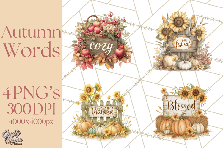 Get ready for autumn with this beautiful collection of 4 high-quality fall-themed clipart files! These designs are perfect for adding a touch of rustic charm to your projects.