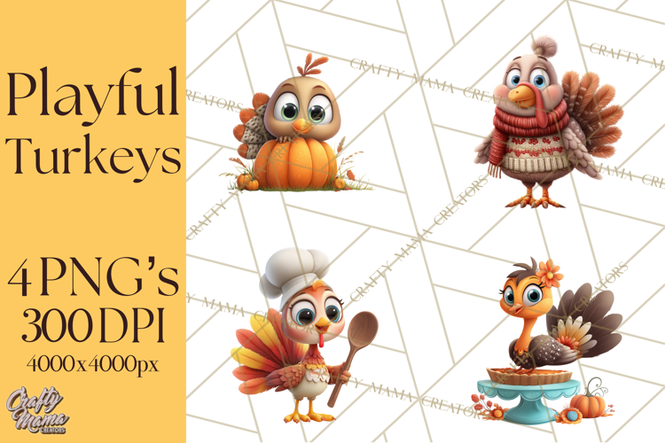 This whimsical turkey clipart collection is perfect for adding playful Thanksgiving cheer to your creative projects! Each turkey character is illustrated in a semi-realistic cartoon style with polished details, making them fun yet versatile for many uses.