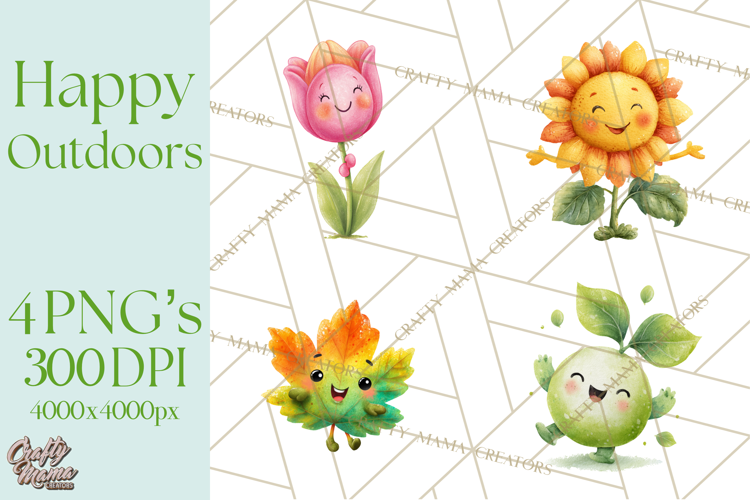 Bring the beauty and charm of the outdoors to your creative projects with this Nature & Outdoors Clipart collection! Each illustration has a cheerful face and whimsical watercolor style, perfect for printable and digital designs.