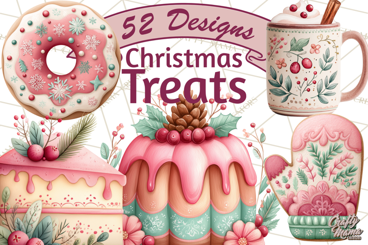 Each design is rendered in a gentle watercolor style with warm beige, blush pink, cranberry, and pine green tones. From snowflake cookies and candy cane mugs to gingerbread houses and holiday pies, these treats bring a festive, kitchen-inspired charm to your creative projects.