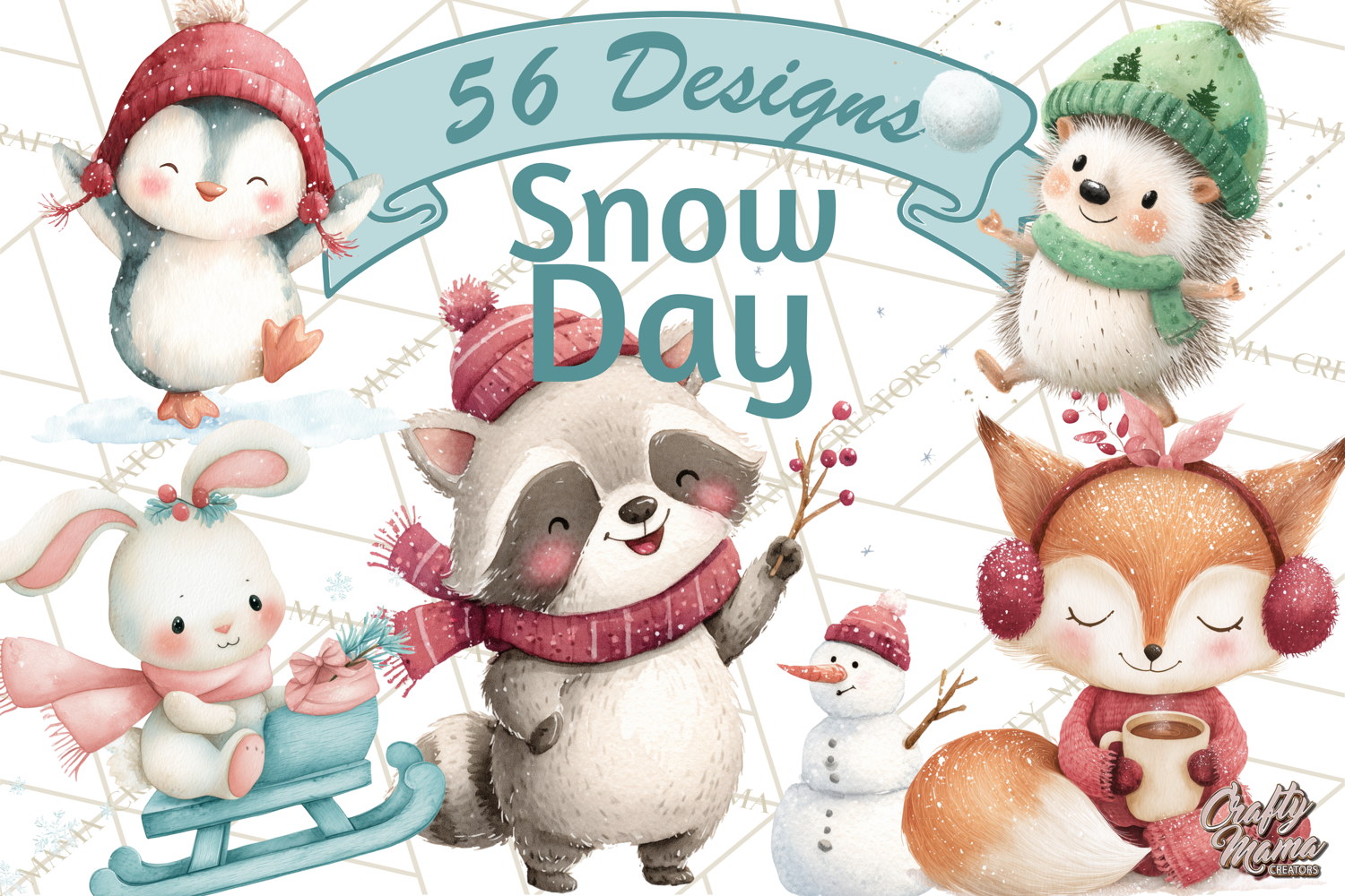 Snow Day Fun PNG, Watercolor Winter Animal Clipart