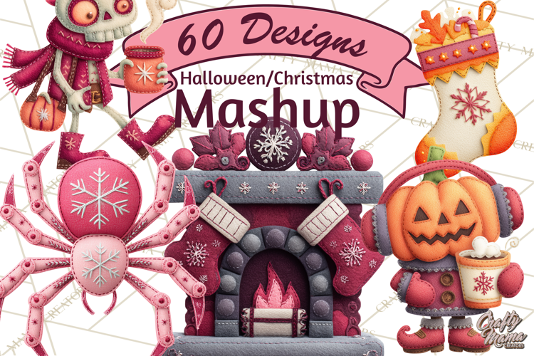 Celebrate spooky season and holiday cheer all at once with this Halloween to Christmas Mashup clipart collection — a cozy set of stitched felt illustrations featuring ghosts, pumpkins, bats, skeletons, and more in festive winter outfits.