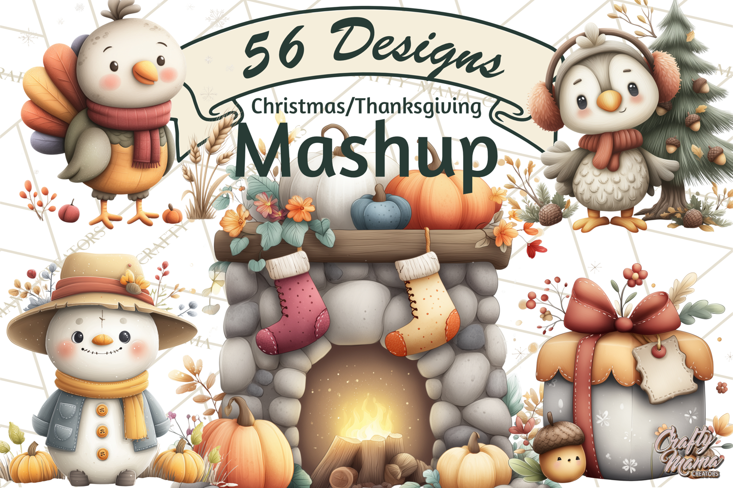 Add cozy charm to your seasonal designs with this Christmas Turkey Clipart Bundle — a rustic collection of holiday graphics featuring turkeys in Santa hats, pumpkins with snowflakes, fall leaves, pinecones, and festive crossover scenes.