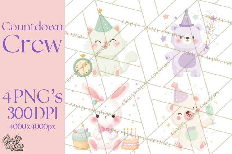 Celebrate the countdown in style with this New Year PNG Clipart Bundle â€” a festive collection of pastel party characters featuring elves in party hats, pets with confetti, countdown clocks, champagne props, and celebratory accessories.