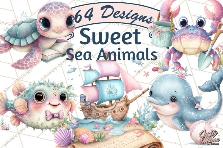 Dive into a whimsical underwater world with this adorable digital download! This is a set of 64 individual high-quality images featuring a variety of cute ocean animals and fun accessories.