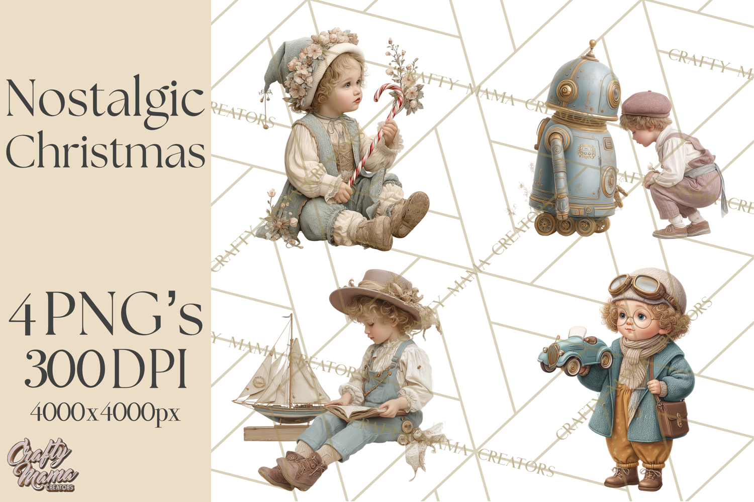 Decorate your projects with this charming Vintage Christmas Clipart. This collection features a charming, vintage-inspired look in a beautiful palette of blues, creams, and pinks. Filled with gingerbread characters, friendly elves, and classic ornaments, these high-quality images are perfect for creating unique holiday cards, festive prints, gift tags, or other vintage-style crafts.