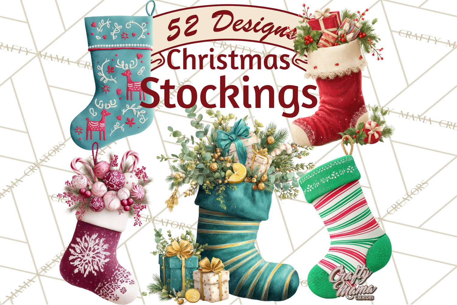 Add festive charm to your holiday projects with this Christmas Stockings clipart set! Featuring 52 realistic stockings in a wide variety of colors, patterns, and textures — from jewel tones to pastels, and decorated with snowflakes, reindeer, holly, and stripes. Some stockings are stuffed with gifts, candy canes, ornaments, or greenery, while others are empty and ready for your designs.