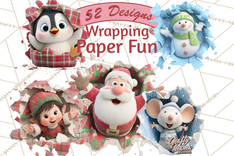 Bring cheer to your designs with this festive set of 52 high-quality digital images! These characters and props are depicted mid-burst through a vibrant wrapping paper wall, ready to add a dynamic touch to your holiday creations. Use them for unique greeting cards, digital scrapbooking, and custom apparel.