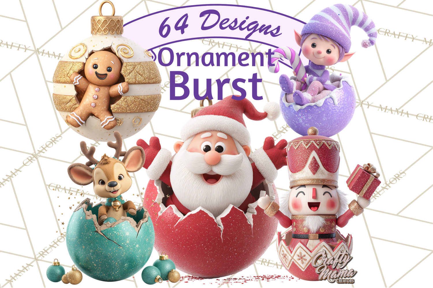 Bring the holiday magic to your projects with this adorable collection of Christmas characters bursting out of festive ornaments! Each illustration features a playful 3D clay-style character—Santa, elves, reindeer, snowmen, gingerbread people, nutcrackers, penguins, bears, and more—popping from colorful ornaments with solid, striped, polka dot, star, snowflake, plaid, and glittery finishes.