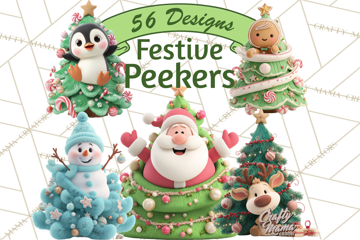 Add playful holiday charm to your projects with this delightful collection of Christmas characters interacting with decorated Christmas trees! Each illustration features a 3D clay-style character—Santa, elves, reindeer, snowmen, gingerbread people, nutcrackers, penguins, bears, and more—peeking, crawling, or bursting out of trees with colorful ornaments, garlands, ribbons, candy canes, stars, and festive touches.