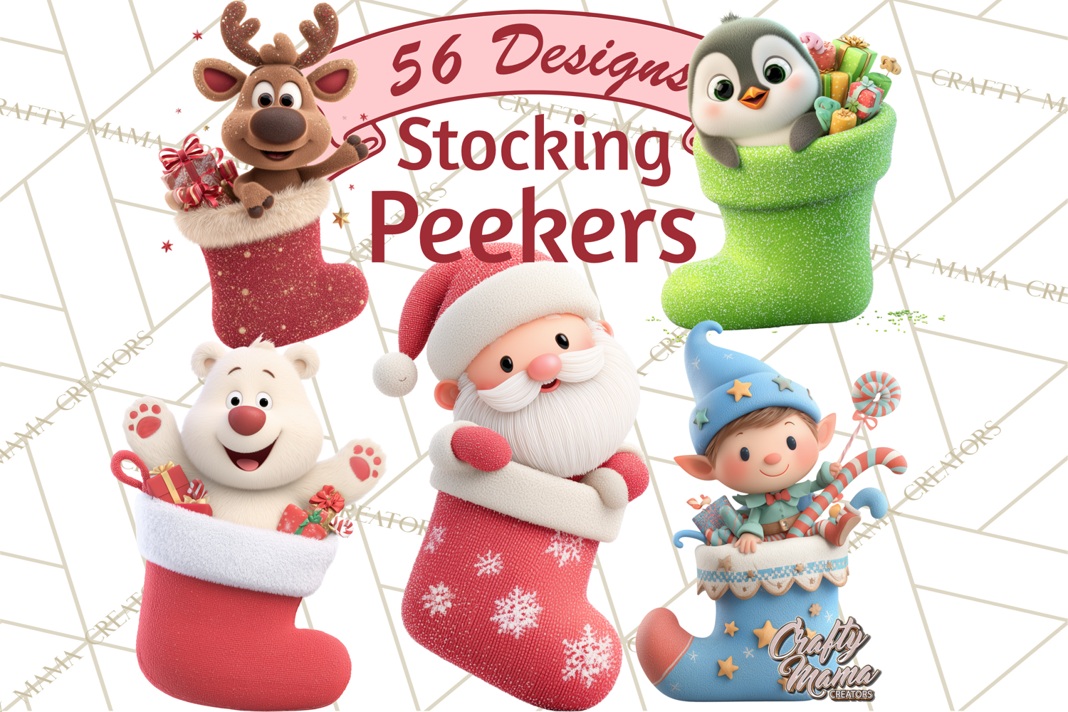 Bring cozy holiday charm to your projects with this whimsical collection of Christmas characters interacting with stockings and sleighs! Each 3D clay-style character—Santa, elves, brown-nosed reindeer, snowmen, gingerbread people, penguins, and bears—is bursting, crawling, or peeking out of festive stockings or sleighs. Some stockings and sleighs feature glittery or shimmering finishes for extra holiday sparkle.