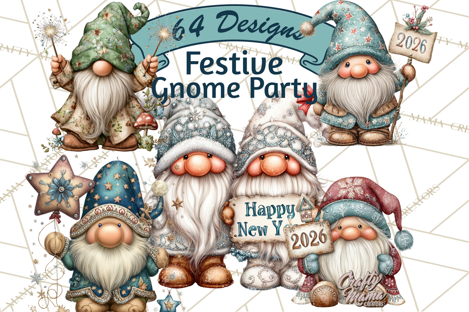 Celebrate the New Year in style with this sparkling set of festive gnome clipart! These cheerful gnomes are dressed in metallic gold, silver, and champagne tones accented with jewel hues of ruby, emerald, sapphire, and amethyst — perfect for party invitations, New Year cards, stickers, and more.