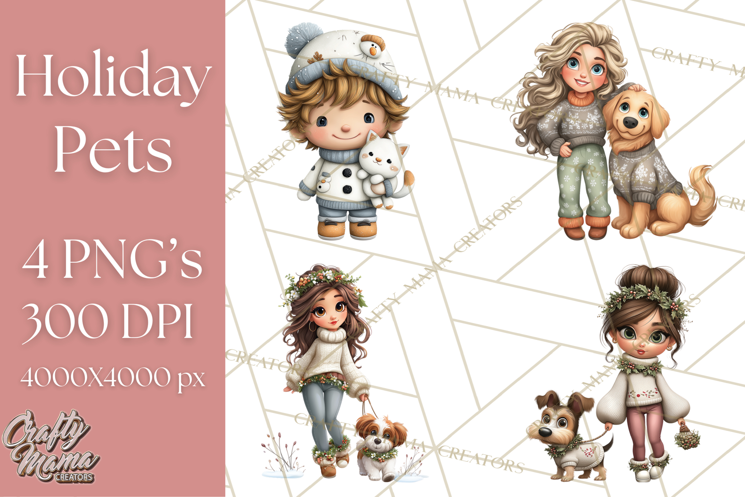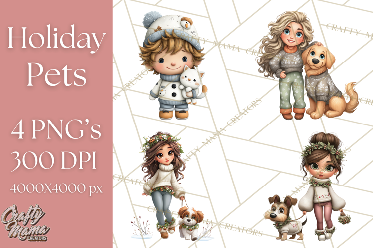 Bring holiday cheer with this Matching Christmas Sweaters clipart collection! Featuring people with their pets in coordinated festive sweaters decorated with reindeer, snowflakes, and Christmas tree patterns, this set is perfect for cozy and heartwarming holiday designs.