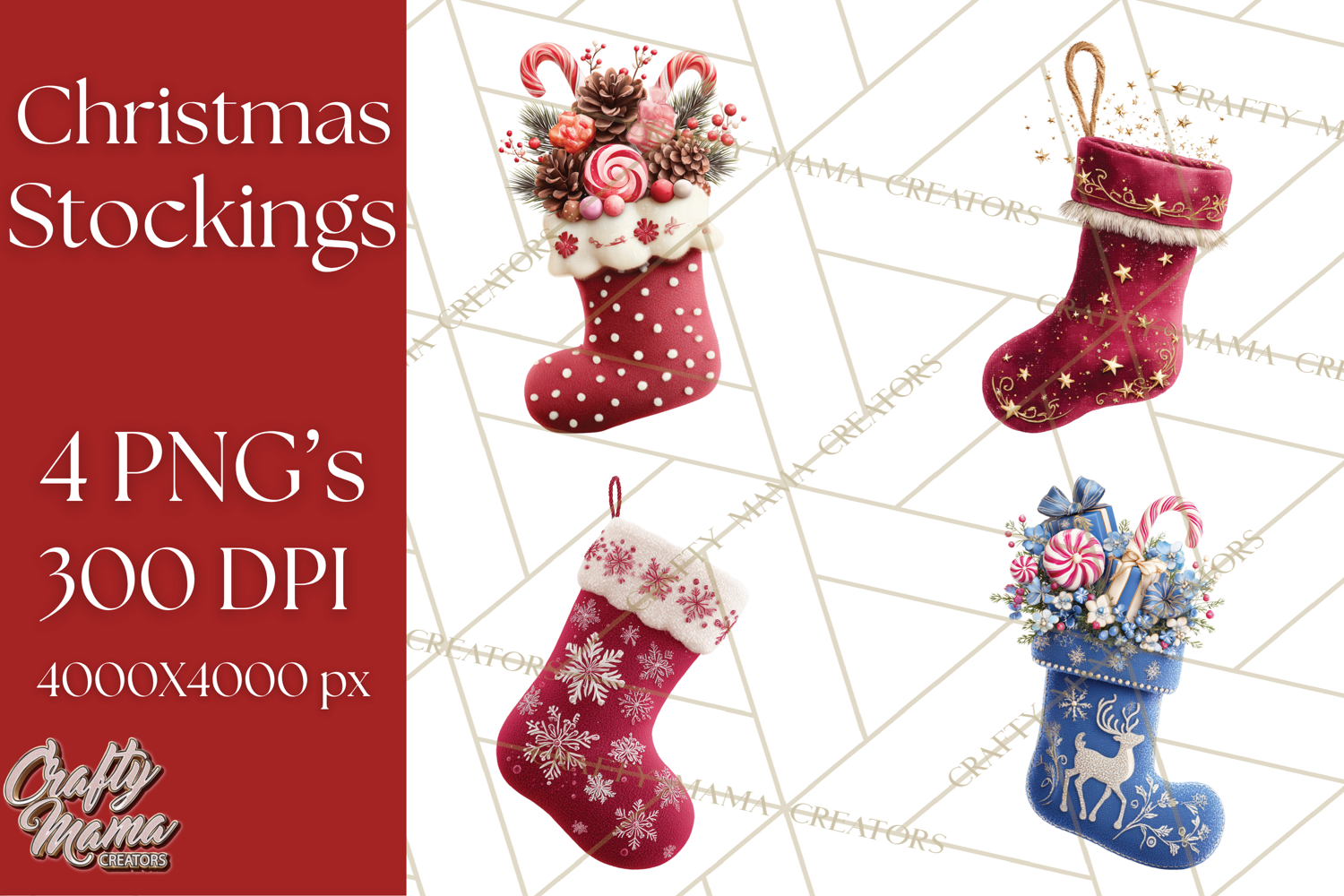 Add festive charm to your holiday projects with this Christmas Stockings clipart set! Featuring 4 realistic stockings in a wide variety of colors, patterns, and textures — from jewel tones to pastels, and decorated with snowflakes, reindeer, holly, and stripes. Some stockings are stuffed with gifts, candy canes, ornaments, or greenery, while others are empty and ready for your designs.