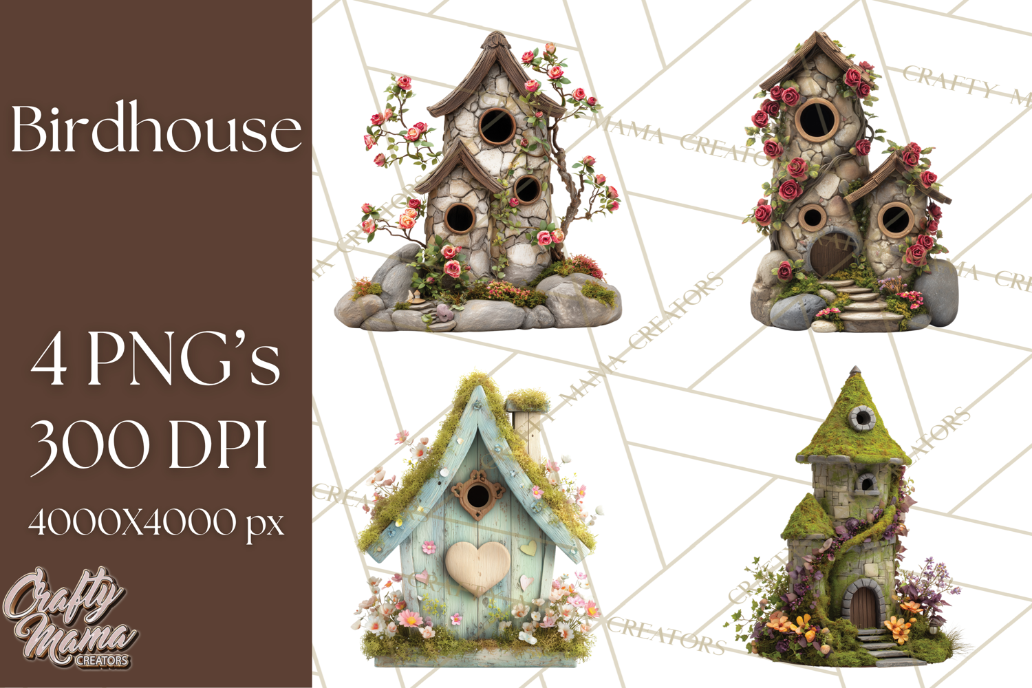 Bring charm and whimsy to your projects with 4 cottagecore birdhouse PNGs! Featuring mossy roofs, rustic wood, flowers, and enchanting fairy-tale designs, these cozy houses are perfect for scrapbooking, digital planners, card making, and printable crafts. No birds included—just delightful fairy garden houses ready to inspire your creativity.
