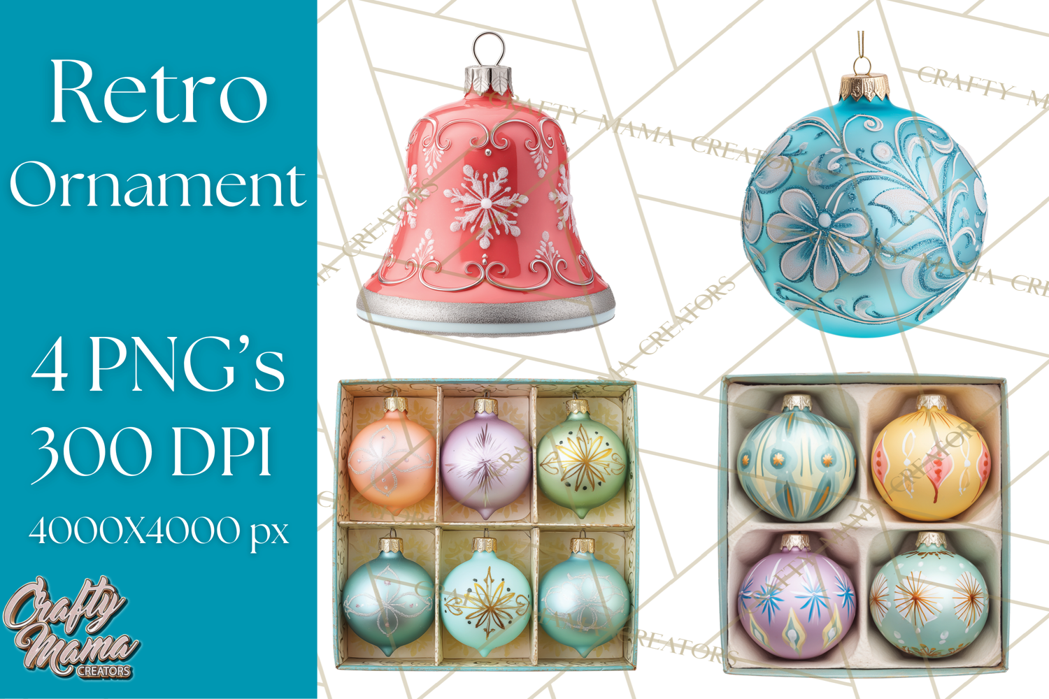 Add nostalgic sparkle to your holiday projects with this Retro Ornament Mix â€” a printable set of 4 high-resolution PNG images featuring vintage Christmas ornaments in pastel tones and mid-century styles. You’ll find atomic starbursts, teardrops, bells, and Shiny Brite-inspired baubles, each designed with clean and crisp lines for a polished finish.