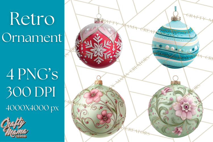 Add nostalgic sparkle to your holiday projects with this Retro Ornament Mix — a printable set of 4 high-resolution PNG images featuring vintage Christmas ornaments in pastel tones and mid-century styles. You’ll find atomic starbursts, teardrops, bells, and Shiny Brite-inspired baubles, each designed with clean and crisp lines for a polished finish.