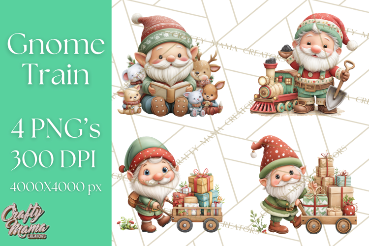 All aboard the festive express! This unique Gnome Train Clipart collection features full body gnome characters working as engineers and conductors, loading gifts onto their miniature Christmas train. Perfect for creating unique holiday cards, children's pajamas, festive sublimation crafts, and Christmas party invitations. Our design pack includes all the gifts, tracks, lanterns, and gnome accessories you need for an adorable project.