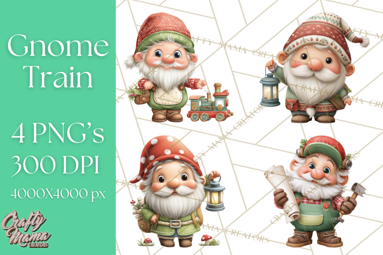 All aboard the festive express! This unique Gnome Train Clipart collection features full body gnome characters working as engineers and conductors, loading gifts onto their miniature Christmas train. Perfect for creating unique holiday cards, children's pajamas, festive sublimation crafts, and Christmas party invitations. Our design pack includes all the gifts, tracks, lanterns, and gnome accessories you need for an adorable project.