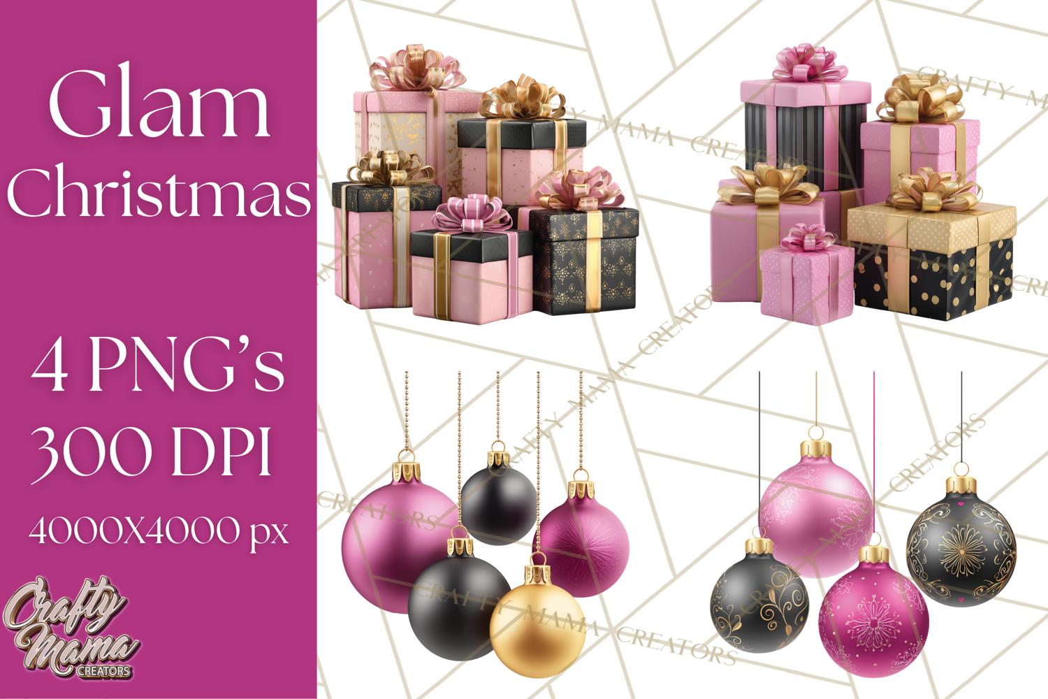 Celebrate a modern and luxurious holiday season with this Pink and Black Glam Christmas Clipart collection! This elegant set features 4 high-resolution PNG images in a stunning color palette of blush pink, matte black, and shimmering gold. Perfect for creating stylish Christmas invitations, sublimation designs, printable decor, and festive branding.