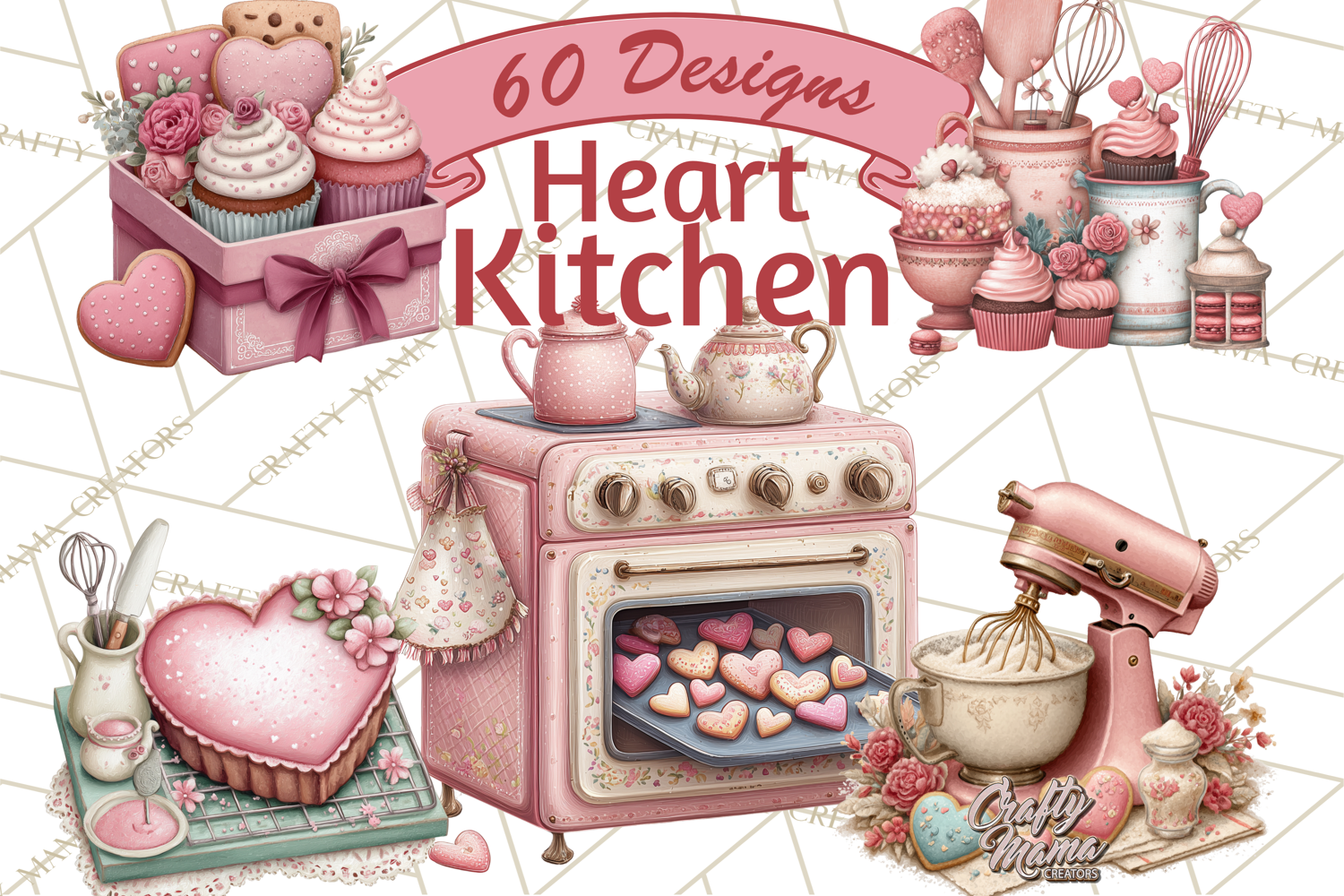 Create sweet Valentine projects with this Whimsical Valentine Baking Clipart Collection! These 60 PNGs include cupcakes, heart-shaped cookies, pastries, rolling pins, whisks, mixing bowls, aprons, and cozy kitchen props — perfect for cards, stickers, sublimation, planners, and printables.