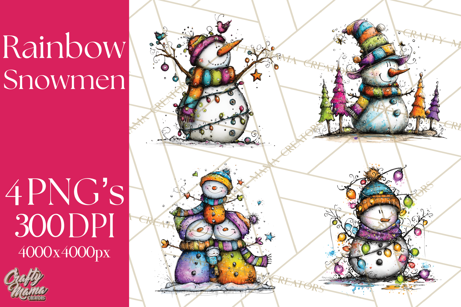 Brighten your holiday designs with this Whimsical Rainbow Snowmen PNG collection! Featuring 44 high-quality snowmen, snowgirls, couples, and snow families in a cheerful watercolor style, each illustration is isolated on a white background for easy use in digital or print projects.