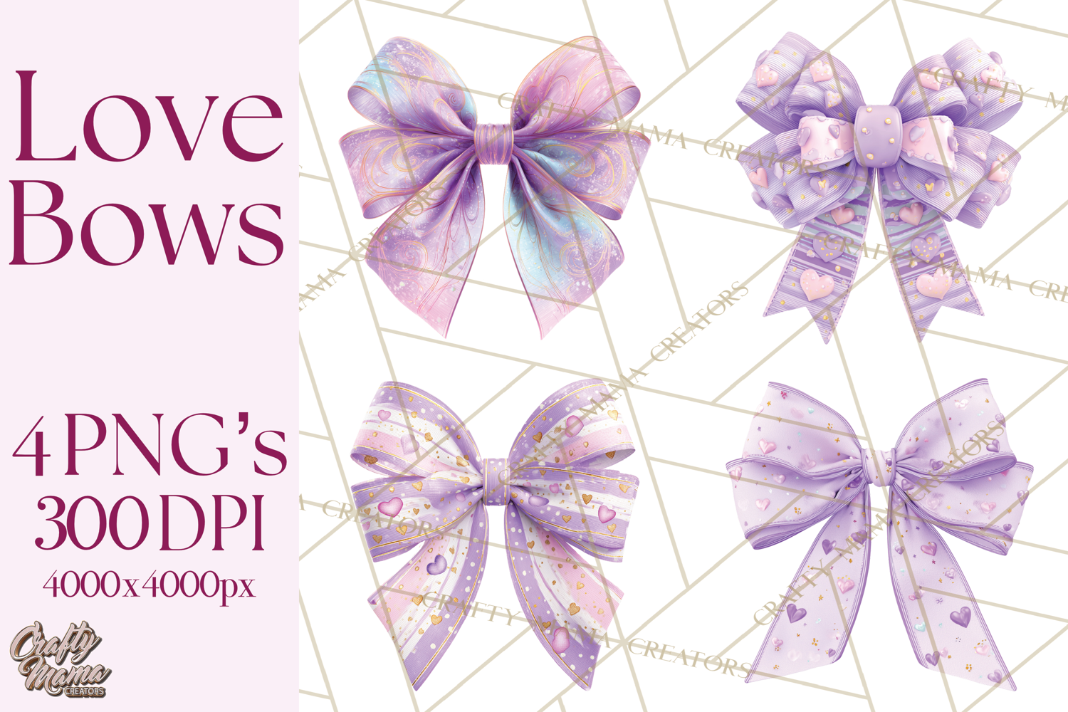 Make Valentine projects extra special with this collection of 4 bows! Each bow features romantic colors, patterns, and textures — hearts, stripes, polka dots, glitter, satin, and metallic finishes in pink, red, blush, lavender, and cream. Perfect for digital or printable crafts.
