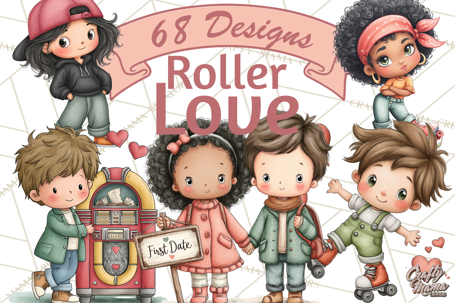 Lace up for fun with The Retro Roller Skating Date Clipart digital download! This nostalgic collection features cute characters and teddy bears in 80s/90s gear, enjoying roller skates, milkshakes, and arcade games at a classic diner. Perfect for retro party invitations, sublimation apparel, unique Valentine's Day cards, and 90s-themed crafts!