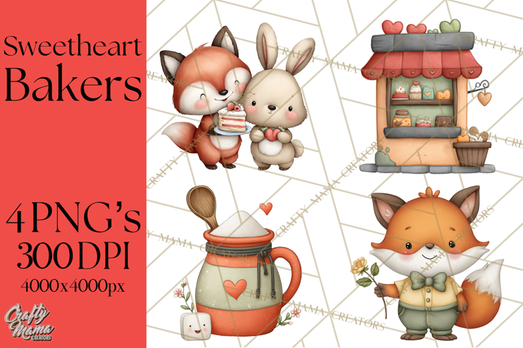 Whip up some love with this delightful Sweetheart Baking Crew Clipart digital download! This charming collection features adorable animal chefs – including a cunning fox, a cheerful bunny, and a cuddly bear cub – busy baking and decorating heart-shaped treats. Perfect for Valentine's Day cards, party invitations, kitchen decor, kids' crafts, and sweet sublimation projects!