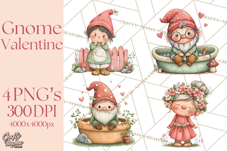 Discover the enchantment of the Garden Gnome's Secret Admirer Clipart digital download! This whimsical collection features adorable garden gnomes tending to heart-shaped topiaries, hiding love letters, and decorating their garden for Valentine's Day. Perfect for creating unique cards, garden signs, funny gifts, and charming sublimation projects!