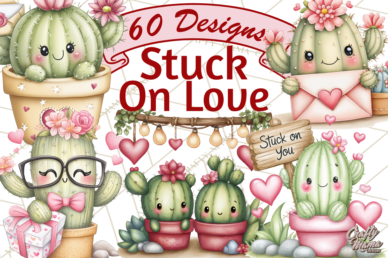 This cheerful clipart collection features happy cactus characters in pink and red pots, surrounded by hearts, love letters, balloons, and Valentine treats. Each cactus is full of charm — smiling, blushing, and ready to spread love!