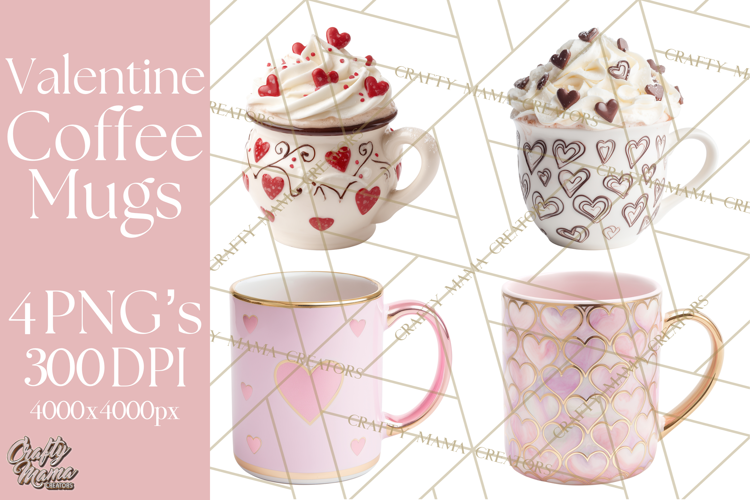 Celebrate Valentine’s Day with this adorable collection of 4 Valentine coffee mugs and cups clipart! Perfect for digital projects, scrapbooking, cards, invitations, social media, and more. Each design is a high-quality PNG300 DPI, and 4000x4000px resolution.