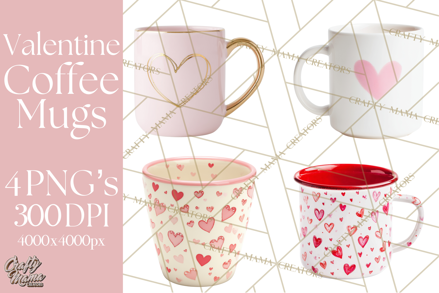 Celebrate Valentine’s Day with this adorable collection of 4 Valentine coffee mugs and cups clipart! Perfect for digital projects, scrapbooking, cards, invitations, social media, and more. Each design is a high-quality PNG300 DPI, and 4000x4000px resolution.