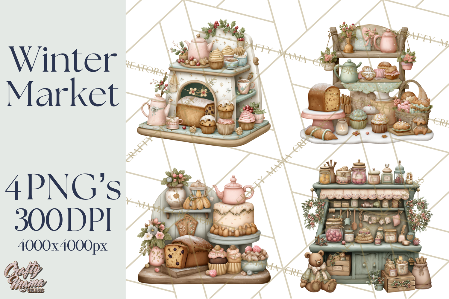 Bring cozy seasonal charm to your designs with this Winter Market Stalls PNG clipart collection! Each illustration features an adorable winter stall—baked goods, cocoa stands, knitted crafts, flowers, candles, sweets, pottery, skating rentals, and more—perfect for January décor, planners, stickers, sublimation, scrapbooking, and printable crafts.